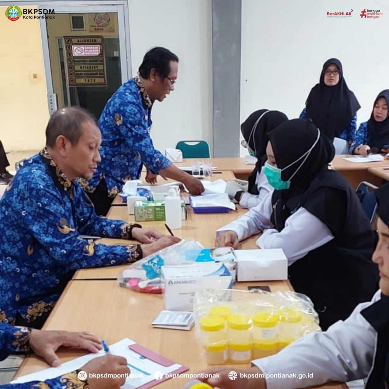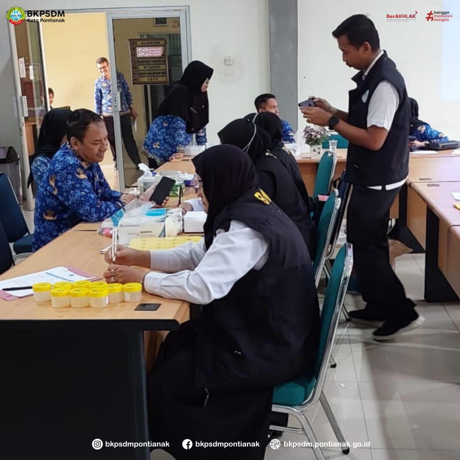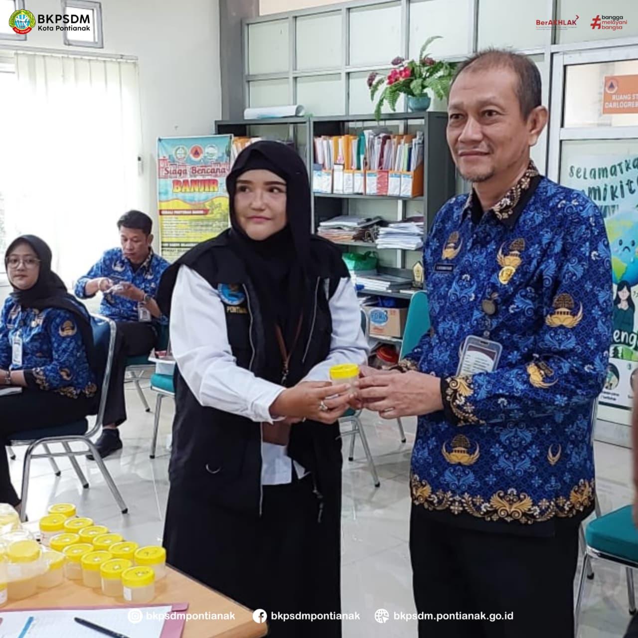 Seluruh ASN di Lingkungan BPBD Kota Pontianak, mulai dari kepala Perangkat Daerah hingga pelaksana, mengikuti tes urine yang diselenggarakan oleh BKPSDM Kota Pontianak bekerjasama dengan Badan Narkotika Nasional Kota Pontianak