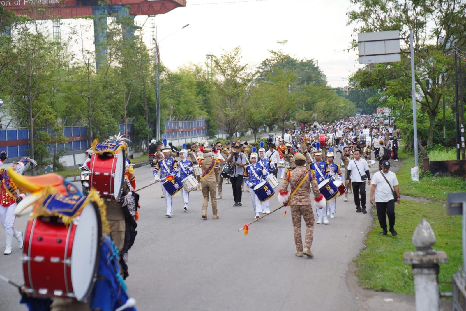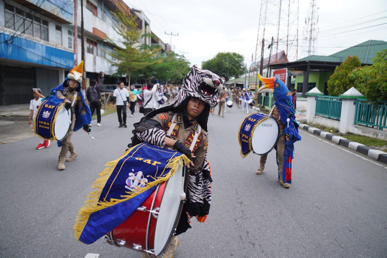PONTIANAK - Momen kebersamaan terlihat saat Wali Kota Pontianak Edi Rusdi Kamtono berbaur bersama seluruh ASN di lingkungan Pemerintah Kota Pontianak berjalan kaki menyusuri rute Fun Walk dalam rangka Ulang Tahun ke-54 KORPRI. Di mulai dari Jalan Rahadi Usman depan Kantor Wali Kota, peserta Fun Walk diiringi Drum Corps Gita Abdi Praja IPDN Kalbar, menuju Jalan Pak Kasih - Hasanuddin - Merdeka - Jenderal Urip - Jenderal Sudirman - finish di Jalan Rahadi Usman. Tiba di depan Kantor Wali Kota, para Praja IPDN menggelar berbagai atraksi drumband.